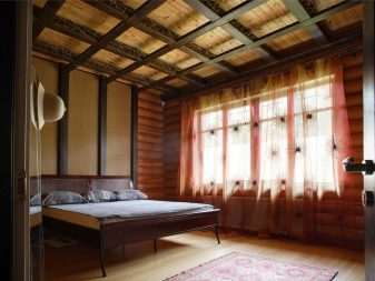 Спалнята в къща, построена от дървен материал, изглежда много хубаво. Таванните греди от дърво са поставени успоредно един на друг, като имат цвят малко по -тъмен от основата на тавана. Те вървят добре с вътрешно обзавеждане. Влизайки в такава стая, веднага усещате атмосферата на топлина и комфорт, която дървото дава.