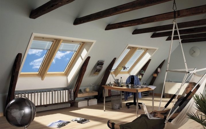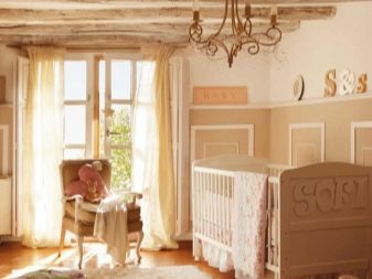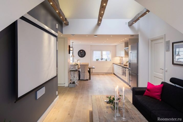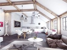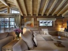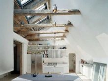 За да украсите такава стая обикновени греди с противоположен на тавана цвят, което ще добави изисканост към интериора.