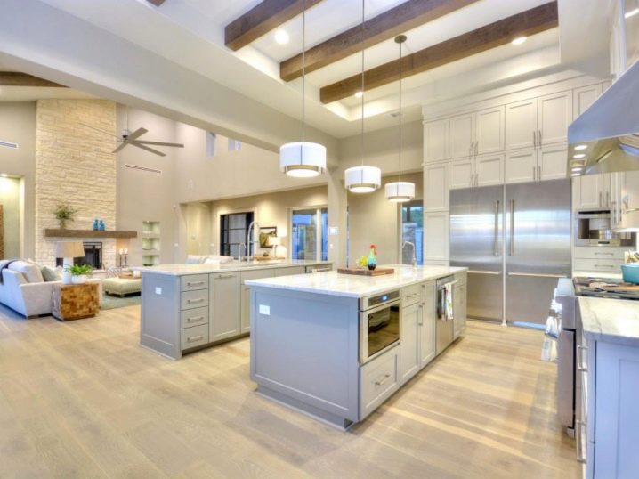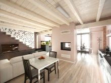 С помощта на таванни греди можете да разделите стаята на няколко зони. Ако вземете кухнята и хола, тогава няма да е трудно да ги зонирате с помощта на бар брояч. А гредите над него перфектно ще допълнят композицията..