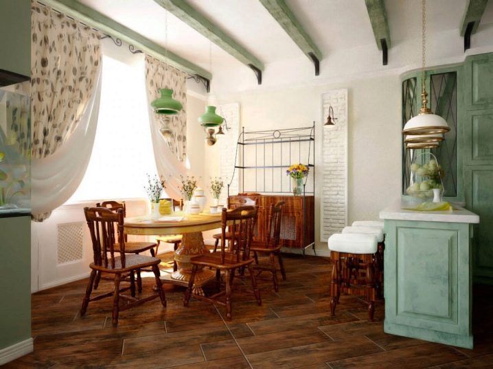 Селският стил е доминиран от естествени материали. Това включва както дърво, така и камък. За декорация често се използват греди, изработени от естествено дърво или с имитация на дърво.. Много често те остаряват изкуствено.. Цветовете могат да бъдат светли или тъмни. Всичко това заедно създава домашна атмосфера..