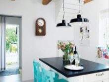 Ако кухнята е с малки размери и завършена в бяло, тогава за да, така че стаята да не прилича на болнична стая, тя може да се разрежда с дървени греди в тъмни нюанси. Шкафовете, които стигат чак до тавана, ще изглеждат красиви. Изглежда, че са продължение на гредите..