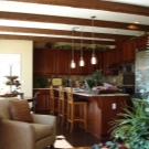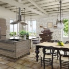 Естественото дърво често се използва при декориране на кухня в селски стил. Таванът и поставените върху него греди имат практически еднаква основа. Дървени шкафове са разположени на пода и се простират чак до тавана, което изглежда много хубаво.