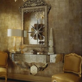 За да се създаде луксозен интериор, най -често се използва мазилка в злато и сребро с перлен ефект. За да намерите такава боя, се препоръчва да се свържете с мениджърите на магазина, където ще закупите довършителни материали..