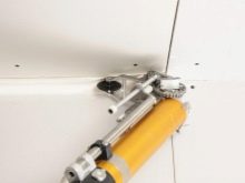 Асансьорът значително ще улесни задачата, ако листът от гипсокартон е прикрепен само към тавана. Листът е фиксиран върху крепежни елементи, издига се до желаната височина и се закрепва със самонарезни винтове. Повдигането на листовете по този начин елиминира възможността за повреда на този крехък материал..