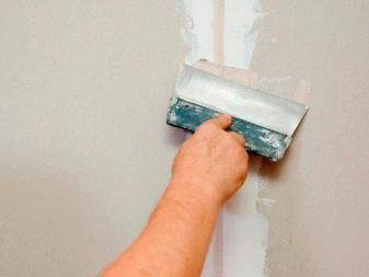 Първоначално всички фуги трябва да бъдат ремонтирани, тъй като те са най -проблемните зони. За да направите това, имате нужда от две шпатули (30 и 15 см ширина). Първият е полезен, за да нанесете мазилка върху всички фуги, а вторият ще ви позволи внимателно да разпределите сместа. След първия етап всички нередности и грапавост ще бъдат скрити.