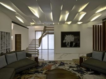 Разработването на изключителни дизайнерски тавани с различни, понякога странни форми може да бъде много скъпо за собственика. Но тя ще бъде единствена по рода си. Съвременните материали позволяват да се направи клетъчната структура на окачения таван почти невидима. Можете да поръчате различни дизайни на плочи и след това да сглобите сложен индивидуален модел от тях на тавана.