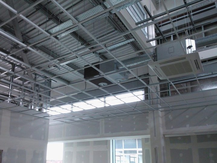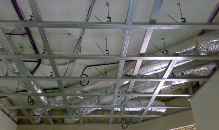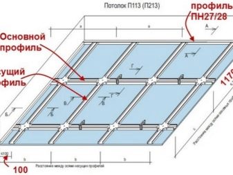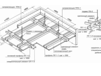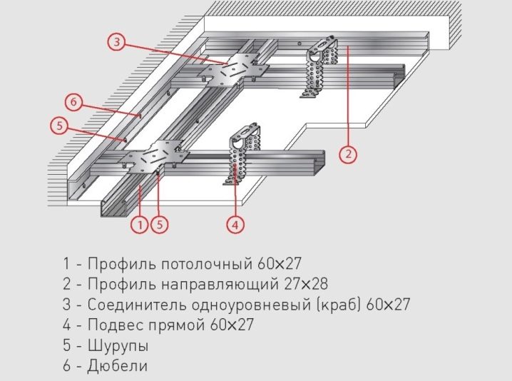 Решетката е изработена от поцинковани стоманени профили. Тя не се страхува от влага, тъй като профилите са защитени от цинк. За таван от гипсокартон или пластмаса ще ви трябват таванни ленти (60×27 mm) и водачи (27×28 mm), както и окачвания, които ще държат конструкцията: пеперуди, съединители, анкерни окачвания, свързващи елементи. За закрепване трябва да закупите самонарезни винтове за метални и полипропиленови дюбели.