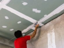 - Листове от гипсокартон. Те дават възможност за създаване на идеално гладко покритие, което може да бъде замазано, залепено с тапети, боядисано, нанесено с декоративна мазилка. С помощта на листове от гипсокартон в интериора се появяват тавани с различни нива и геометрични форми. Гипсокартонът е екологично чист и отговаря на санитарните стандарти. Неговите недостатъци включват факта, че се страхува от условия на висока влажност и се нуждае от покритие..