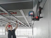 - За да монтирате окачен таван, имате нужда от него по -ниски с поне 15 см. Това е конструктивен минимален просвет за полагане на комуникации и инсталиране на лампи. Можете също да поставите изолация в това пространство. Най -удобният начин за маркиране на стена е използването на лазерно ниво. Вместо това можете да използвате обикновени нива на балончета..