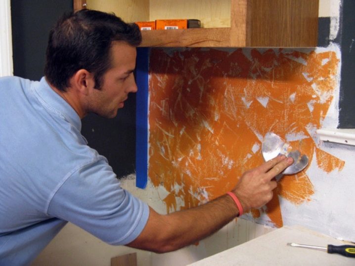 - Премахване на старото покритие. Необходимо е да се премахне старото покритие, да се отстрани боята. Ако премахнете тапета, първо трябва да го накиснете с вода, като използвате спрей бутилка. Това ще намали до минимум количеството прах и ще ви позволи да премахнете големи парчета стари панели. Ако има мазни петна, те не се маскират, а се изстъргват от повърхността. Същото се прави в случай на значително замърсяване..