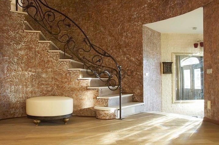 Венецианската мазилка изглежда страхотно при декориране на стълби. Поради играта на контраста на сродни тонове се предава специална атмосфера.