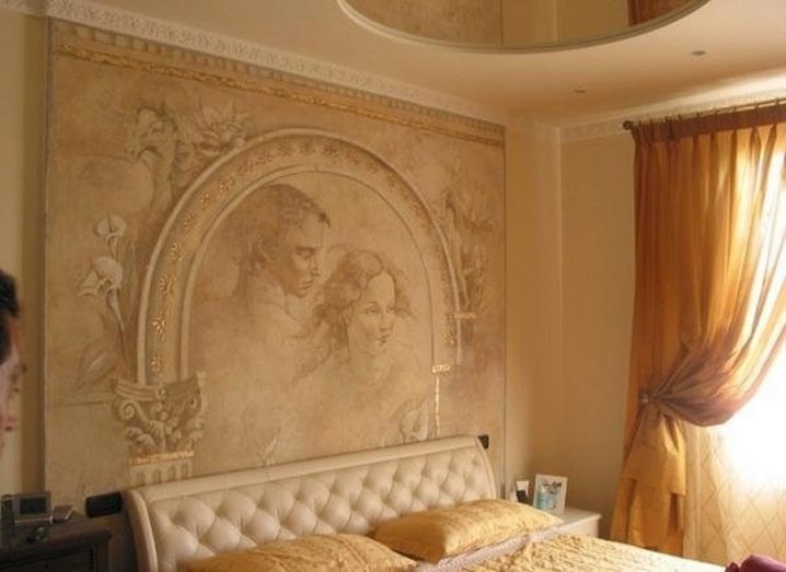 Често повърхностите, декорирани с венецианска мазилка с различни ефекти, са украсени със специални мотиви. Те могат да бъдат почти невидими на общия фон или релефни, напомнящи за скулптурни елементи. И в двата случая, за да подчертаете такъв декор, имате нужда от цветова схема..