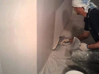 - Подгответе основата за изходния материал. Извършете визуална проверка на основата за довършителни работи. Преди да маскирате проблемните зони, е необходимо да се отървете от неравностите и разпадащите се зони. Всичко, което не се държи добре, се отстранява от основата. Такава основа няма да може да държи гипсовия материал за дълго време. След почистване повърхността се избърсва с полусуха гъба. Това е необходимо, за да може слоят на изходната смес да има висока адхезия..
