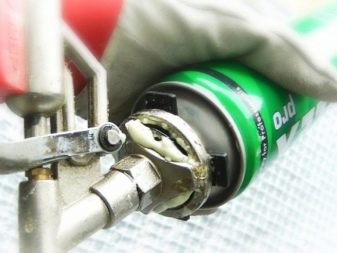 - В близост до връзката за балона има малка топка. Необходимо е също така да се приложи малко количество димексид към него и след това да се прикрепи бутилка с почистващ препарат. След минута или две можете да опитате да натиснете лоста за регулиране.