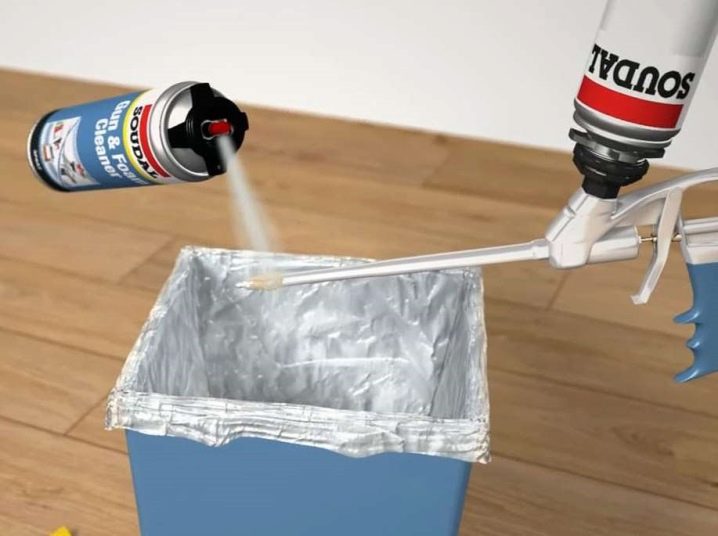 След като приключите с нанасянето на уплътнителя, трябва незабавно да започнете почистването на инструмента. Извадете използваната бутилка. Ако в него все още има пяна, не е нужно да изхвърляте буркана – веществото в него ще запази свойствата си за дълго време..