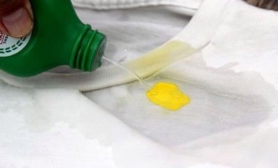 - Заместете оцветената зона под водна струя. Препоръчително е да включите студена вода. Внимателно измийте замърсената зона със сапун за пране или препарат..