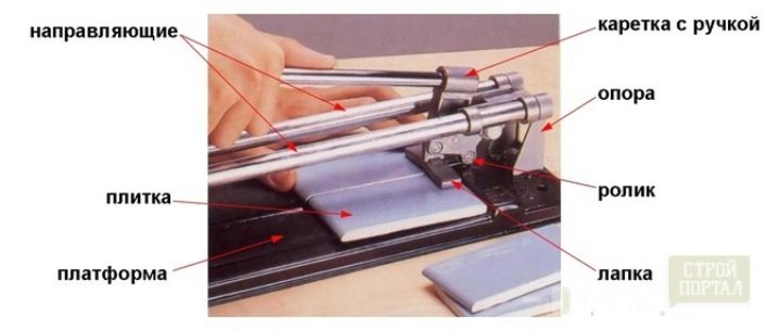 Устройството на ръчна фреза за плочки се счита за възможно най -просто. Той използва подвижна дръжка, в края на която има режещ елемент и езичета, които чупят плочките. Основната повърхност на инструмента има плитък жлеб, с помощта на който счупването се получава възможно най -равномерно. Много е лесно да се разделят плочки по диагонал с помощта на ръчна или машинна механична фреза за плочки.