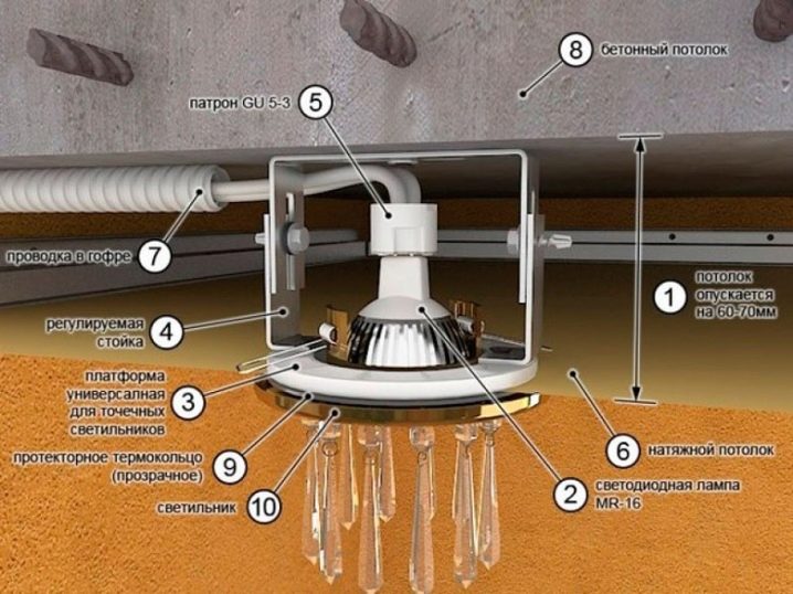 Между тези два тавана (основен и окачен), благодарение на сглобената и неподвижна рамка, се образува свободно пространство до 10 см. Това празно пространство скрива електрическото окабеляване за свързване на бъдещото осветление и основните конструктивни елементи на източника на светлина. За свързване на лампи и различни източници на светлина в такъв таван се правят специални отвори.. Отличителна черта на такъв таван е възможността за инсталиране на вградени лампи..