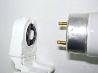- Специален патрон. Този монтаж е разпространен във флуоресцентни и LED осветителни тела. При подмяна, както в предишната версия, извадете фиксатора, извадете стъклото и развийте източника на светлина. Тази касета трябва да се завърти на деветдесет градуса при смяна..