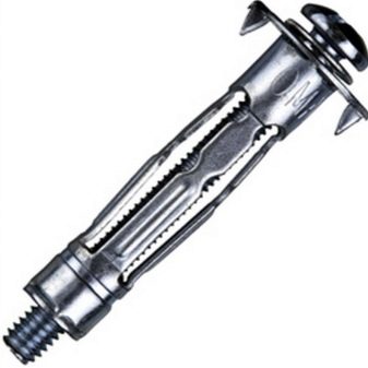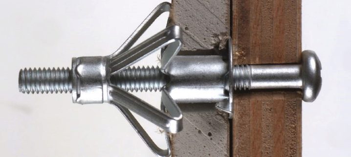 Дюбелът Molly ви позволява да прикрепите дори големи кухненски шкафове към стена от гипсокартон. Това е метален хардуер с винт, който има странични слотове. Инсталира се със специални клещи. В гипсокартона е необходимо да се направи дупка, съответстваща на диаметъра на дюбела, и след това да се постави стойката, огъвайки крилата и завъртайки винта.