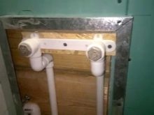 Инсталирането на оборудване в банята заслужава специално внимание. Фиксирането на миксера тук не е толкова лесно, колкото при тухли или бетон. Изходът за вода помага за опростяване на процеса.. За надеждно закрепване на фитинга, в кухата стена са монтирани траверси (специални плочи с отвори). Структурно те могат да се различават, така че ще трябва да намерите най -добрия вариант за закрепване на изход за вода. Този подход ви позволява здраво да фиксирате конструкцията, която извежда тръби за отопляема кърпа или смесител.