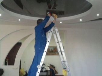 Преди да започнете работа, трябва да премахнете всички бижута; повърхността се избърсва в кръг, като постоянно се натиска, но не прекалено силно. Дори при най -внимателната работа, петна често остават по лъскавите тавани и за да ги премахнете, трябва да избършете повърхността на сухо. При което се използват кърпички от микрофибър, отлично улавяне дори на значителни количества влага.