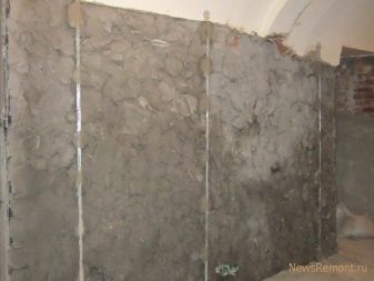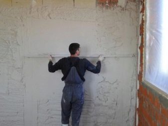 Можете да направите основния слой доста дебел (около 50 мм). Нанесете мазилката с мистрия и разтегнете с мистрия. Слоят трябва да съответства на нивото, на което са разположени маяците. Движете се отгоре надолу. След приключване на обработката на една част от повърхността, отстранете излишната мазилка, като използвате правилото.