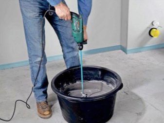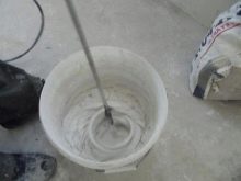 - Смесете материала с помощта на въртящ се чук със специална приставка или бормашина. Добавете вода към сместа, като разбърквате.