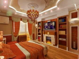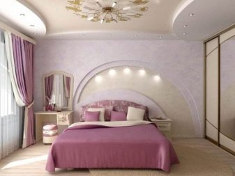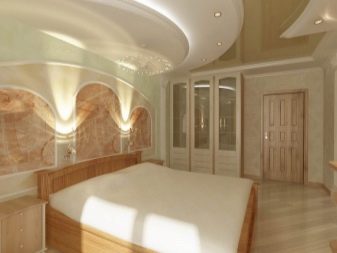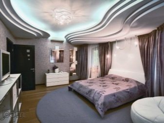 Къдравите структури на тавана под формата на вълнообразни и плавни линии правят спалнята по -елегантна и привлекателна. Тук също е важно да се използват различни геометрични фигури. Този дизайн не губи своята актуалност през годините и се счита за един от най -популярните. Таван във формата на сърце с необичайно осветление ще придаде нотка на романтика, благоприятстваща добрата почивка и релаксация..