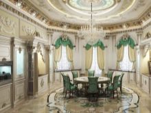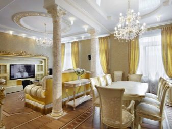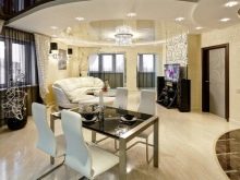 - Хол. Къдравите тавани в хола изглеждат оригинални и необичайни. Именно тази стая се счита за идеалното място за изпълнение на най -смелите и необикновени дизайнерски решения..