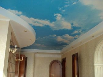 Цветовата гама на продуктите може да бъде доста разнообразна, но най -оптималните решения ще бъдат бели, сини и златисти нюанси. Таванът в тази палитра изглежда елегантен и луксозен едновременно..