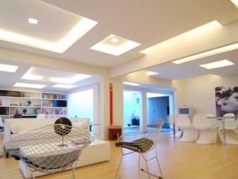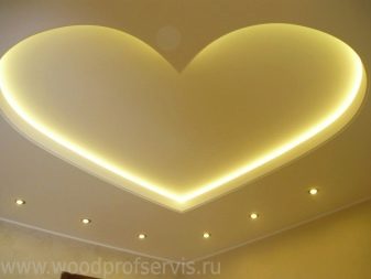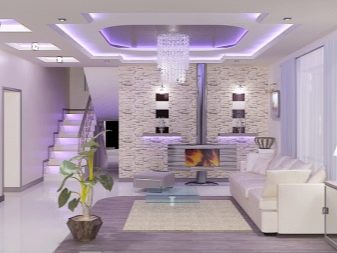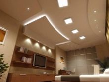 Видът и цветът на осветлението се избират въз основа на характеристиките на конструкцията от гипсокартон, както и на предназначението на помещението. Това може да бъде или обикновен полилей, или прожектори, допълнени от LED осветление..