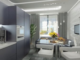 Рационален и строг стил висока технология ви позволява да се възползвате максимално от въображението си, експериментирайки с ясни или остри линии, хармонично допълнени от абстрактни изображения. Цветовата схема на такива къдрави тавани включва бели, сиви и златисти нюанси. Техният хладен и безличен външен вид е най -подходящ за работни помещения и кухни, където има нужда да се създаде спокойна и спокойна среда..