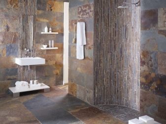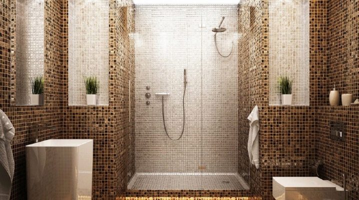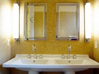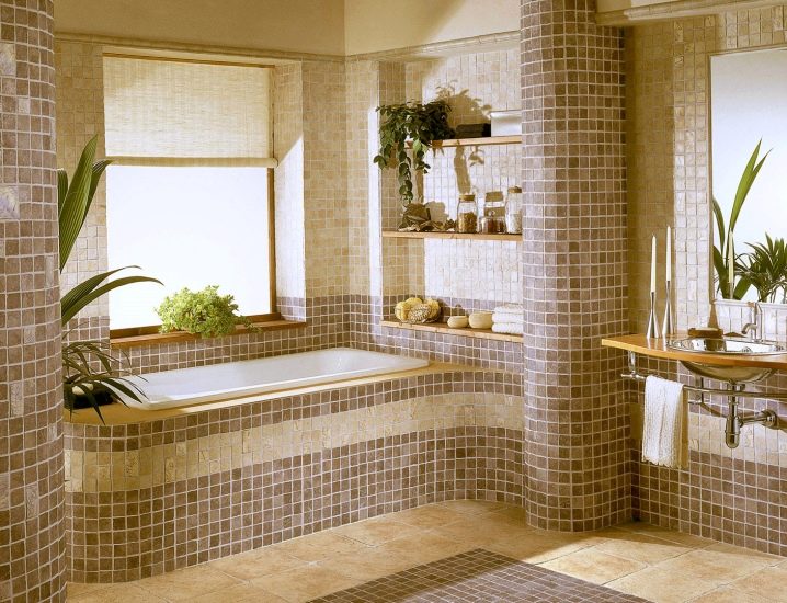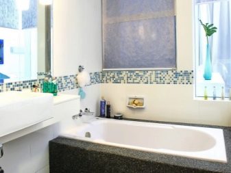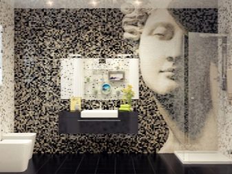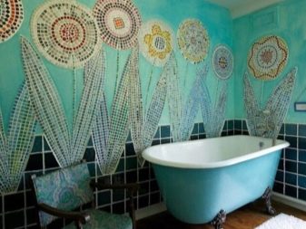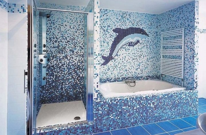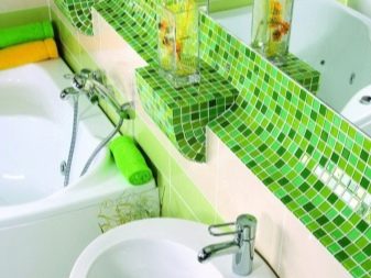 Удобно е да поставите труднодостъпни места, кутии за тръби и водопроводни инсталации в банята с мозайки. Изобилието от пъстри малки мозайки визуално намалява стаята. Спокойните дълбоки цветове често се използват за бани и тоалетни. Например, дълга синя лента под формата на бордюр по периметъра на снежнобели стени ще внесе съживяващи нотки в едноцветно пространство и ще подчертае геометрията на стените..