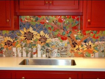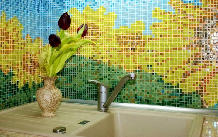 Декорирането на повърхността с мозайка с плочки ви позволява да скриете пръски, капки пара и мазнини поради малки детайли. В края на кухненската работа е лесно да се почиства с домакински продукти. По същите причини керамичните мозаечни плочки са подходящи за подови настилки в кухнята..
