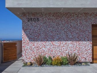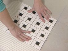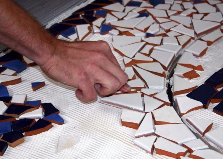 Мозаечни чипове-чипове вече са нанесени върху по-големи глинени плочки, готовият облицовъчен материал се нанася върху повърхността по обичайния начин за полагане на плочки.