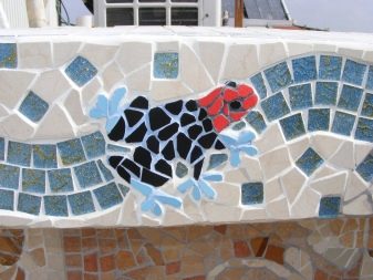 Ако интериорът не предполага строги класически изкушения, създадени от майстори, можете да направите мозаечната облицовка със собствените си ръце. За да направите това, ще ви трябват счупени парчета разноцветни плочки със същата дебелина и текстура. Керамиката лесно се чупи с чук, увит в мека кърпа, острите ъгли на стружките се смилат. Контурите на шаблона се нанасят върху повърхността, която трябва да бъде декорирана, след което чиповете се поставят върху лепило за керамични плочки..