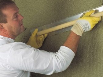 След като мазилката е нанесена върху стената, тя се подрязва. Ако е необходимо, изпълнете текстуриран модел. Кофата се почиства незабавно.