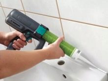 - За да нанесете състава върху основата, трябва да използвате специален силиконов пистолет. Ще трябва да отрежете върха на самия уплътнител и да поставите дозатор върху него. Дозаторът също ще трябва да направи разрез, като по този начин регулира потока на материала.