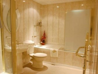 PVC панели се използват най -често за лепене в банята, тъй като този материал е в състояние да запази характеристиките си в помещения с висока влажност, липса на вентилация и малки размери. Техният експлоатационен живот е до 10 години, а цената се счита за доста приемлива..