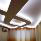 LED таванното осветление ви позволява да променяте цвета на стените и мебелите на тъмно. Той може да има няколко режима на превключване, от трептене до статично. Управлението се осъществява от дистанционното управление. Недостатъкът е цената на монтажа в готова конструкция. Ще трябва да се демонтира, което не е страшно за опънати тавани, и да се инсталира отново. Тук е възможно или да се монтира таванът не от край до край, тогава празнината ще се вижда през деня, или да се монтира директно към тавана, след което лентата ще бъде видима. Таванът трябва да е бял..