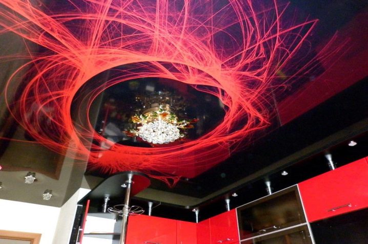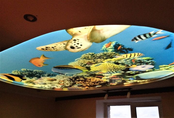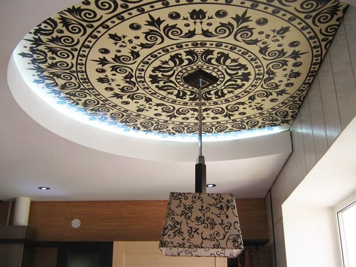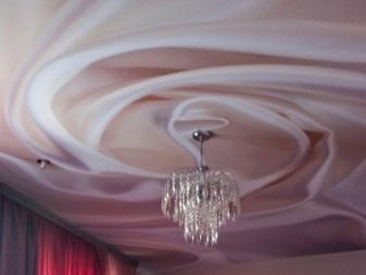 За тавани от плат обикновено се използват фотопечат и акрилни бои. Като модел най -често се използват флорални мотиви. Можете да боядисате такъв таван в плътен цвят, хармонизиращ или контрастиращ с цвета на стените, или да създадете уникален модел благодарение на боите върху тъканите.. В този случай работата трябва да се извърши след инсталирането..