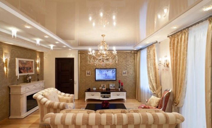 При избора на материал за таванско покритие в хола няма правила. Трябва да се има предвид, че лъскава повърхност ще увеличи размера на помещението и ще добави светлина към потъмнелата стая. Матовите и тъкани тавани са по -подходящи за помещения, разположени от слънчевата страна. Гланцовите модели в смели цветове допълват хола в поп-арт. Таваните, подобни на велур, ще добавят помпозност към хола. Тази опция ще допълни перфектно стаята в античен стил..
