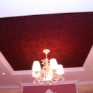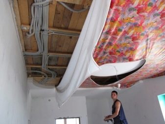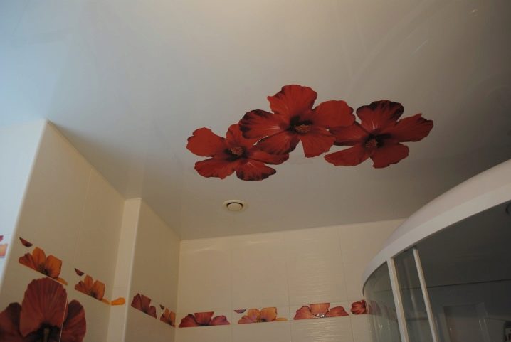 За тавани от плат обикновено се използват фотопечат и акрилни бои. Като модел най -често се използват флорални мотиви. Можете да боядисате такъв таван в плътен цвят, хармонизиращ или контрастиращ с цвета на стените, или да създадете уникален модел благодарение на боите върху тъканите.. В този случай работата трябва да се извърши след инсталирането..