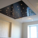 Интересен и един от най -популярните варианти е да създадете звездно небе над главата си. Той е идеален за спалнята и хола. Можете да се любувате на звездите от уюта на вашия дом. За такъв таван ще са необходими оптични влакна, които ще блестят през малки пробиви..