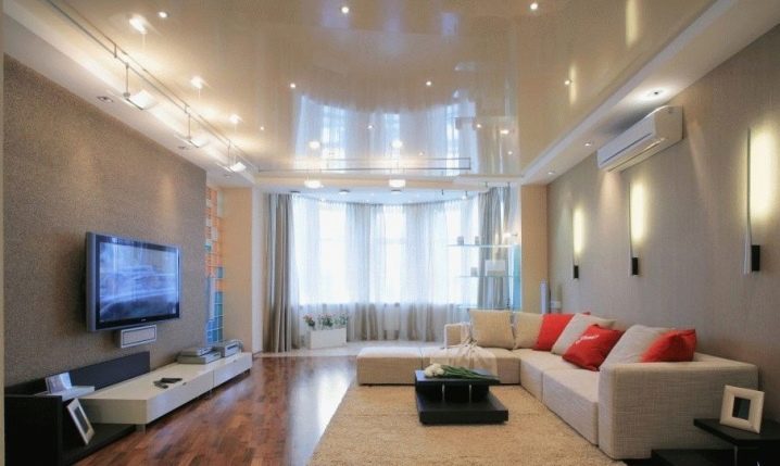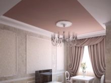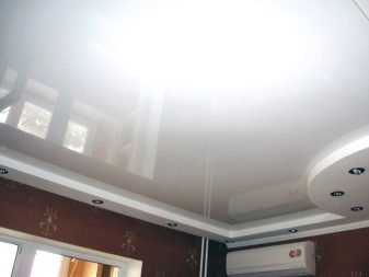 Лъскава, ярка повърхност в центъра ще направи леглото в центъра да се откроява и да отвлича вниманието от килерите. В хола инсталирането на такъв таван ще ви позволи да разделите зоната за отдих и активната зона.. В коридора и банята такива тавани рядко се монтират поради малката площ..