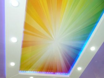 LED таванното осветление ви позволява да променяте цвета на стените и мебелите на тъмно. Той може да има няколко режима на превключване, от трептене до статично. Управлението се осъществява от дистанционното управление. Недостатъкът е цената на монтажа в готова конструкция. Ще трябва да се демонтира, което не е страшно за опънати тавани, и да се инсталира отново. Тук е възможно или да се монтира таванът не от край до край, тогава празнината ще се вижда през деня, или да се монтира директно към тавана, след което лентата ще бъде видима. Таванът трябва да е бял..