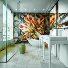 На закрито стенните мозайки могат да покрият една от стените на стаята. Тя може да бъде едноцветна с игра на нюанси, матови и лъскави повърхности от различни парчета. Но също така с помощта на мозайки можете да създавате декоративни шарки или картини на стената. Можете да поставите мозаечна картина върху фрагмент от стена, заобиколен от други довършителни материали. Така че платното ще изглежда изгодно на по -спокоен фон..