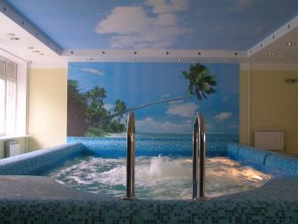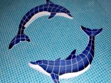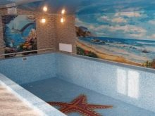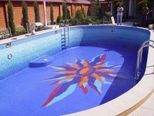 Използвайки една от стените и дъното, можете да направите ярък акцент както под водата, така и над нея. Достатъчно е да скицирате скица на чертежа или орнамента, от който се нуждаете, а специалистите по довършване на басейна ще оживят всяка представа за клиента..