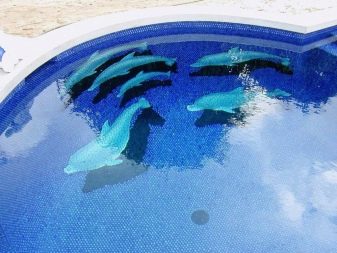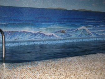 Оригиналното украшение под формата на мозайка за купата на басейна ще промени радикално стила му. Класиката на жанра са морски теми: сини, сини, зелени и тюркоазени нюанси – като цяло всичко, което ни напомня за морето. Не случайно дори е изобретен такъв нюанс като “aqua” – кръстоска между синьо и зелено. Можете да създавате визуални преливания на такива нюанси, подчертавайки дълбочината на отделните зони с по -тъмен цвят. Като имитация на морското дъно си струва да се използват композиции под формата на корали, риби, морски звезди и водорасли..